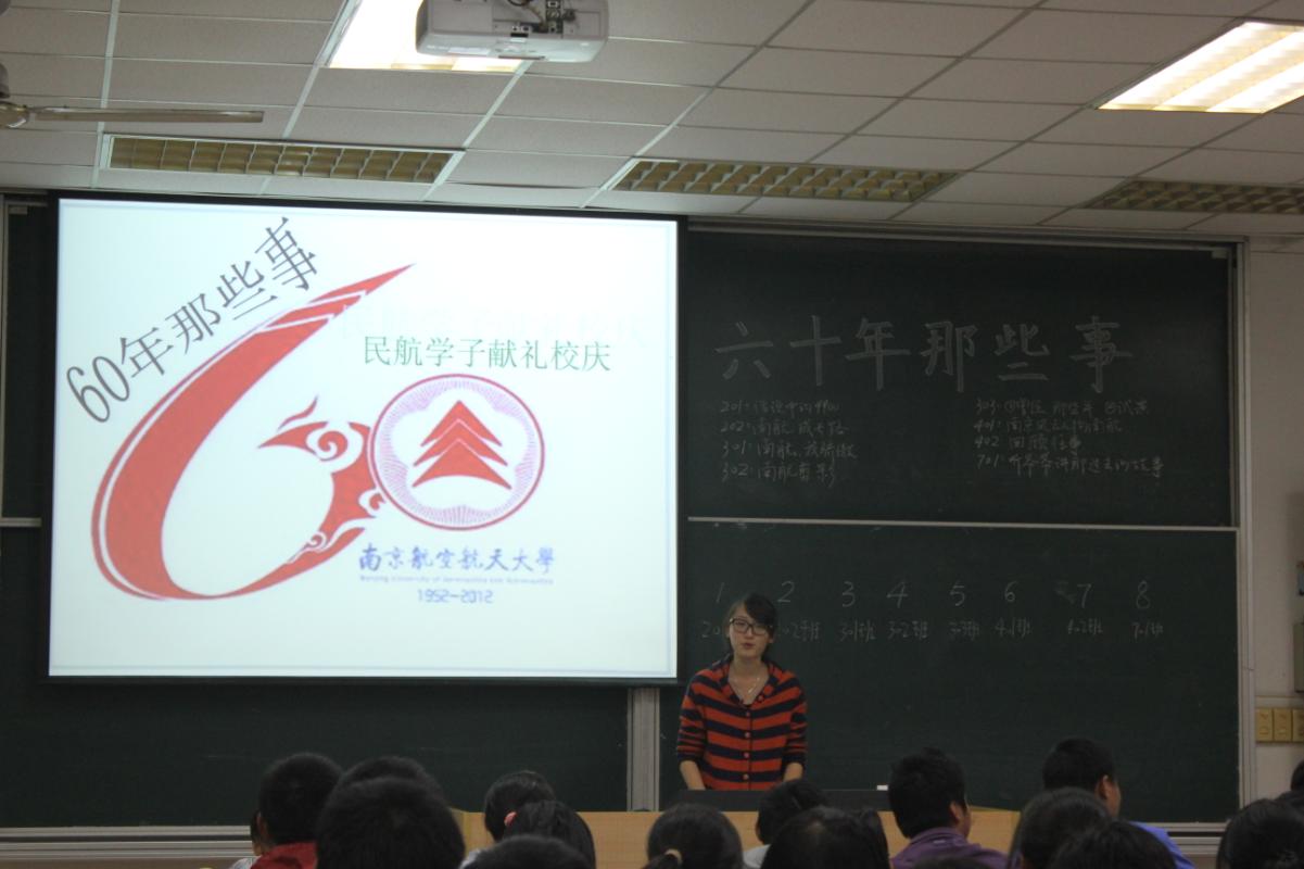 在开学初的第一次年级大会上,皇家华人 2012级所有学生观看了南航发展六十年的视频,视频生动再现了南航的历史与积淀,也让新生对南航,对这个即将生活四年的地方有了直观的认识。同时,年级大会上辅导员也以南航六十年发展轨迹为线索,结合2012级新生的成长脚步,以“南航——成就梦想的地方”为题向大家讲述了梦想的南航,让新生与南航建立了新的链接,有了更加感性的认识。为了让各位同学尽快的适应大学的学习生活,了解南航,在新生军训期间,学导们也深入到宿舍中,介绍南航,向同学介绍他们眼中的南航,他们在南航遇到的人、发生的事,逐渐增加了同学们对了解南航历史的兴趣。建立了理性与感性的认识之后,年级建立了自主学习网络平台,在人人网、年级微博上对校史知识进行介绍,同学们通过浏览网页和留言互动,进一步加深了对校史知识的掌握。
