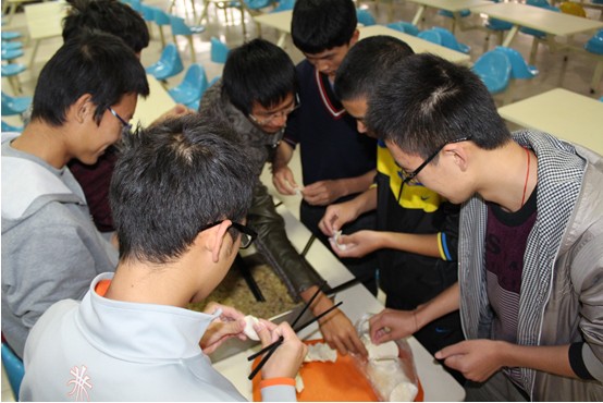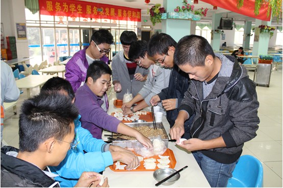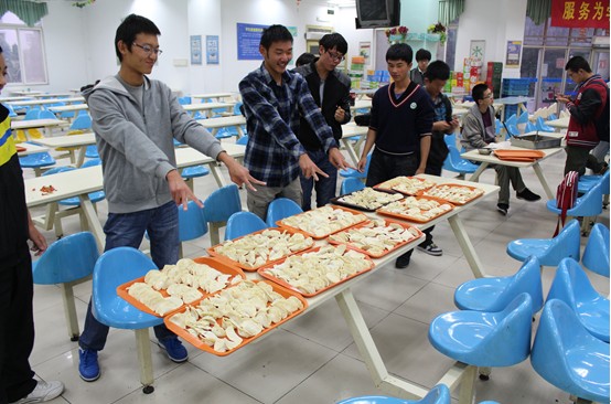 机务工程都是帅小伙,包饺子的功力丝毫不逊色于女生。左手托饺子皮,右手填馅,蘸水,封口……一板一眼,有模有样。辅导员也前来助阵,大显身手。大家兴致颇高,饺子的数量也在不断增加。不一会儿,各式各样的饺子充盈了桌子,包子形、飞碟形、菊花形……虽然饺子形状千奇百怪,但在笑声中,大家忘却了自己略显笨拙的手法,忘却了节日无法与家人团聚的失落,此时此刻,同学便是亲人,民航/飞行皇家华人就是家!许多同学受到现场氛围的影响拿起电话,提醒父母立冬要吃饺子,告诉他们自己亲手包饺子的事,浓浓的感恩之情洋溢。