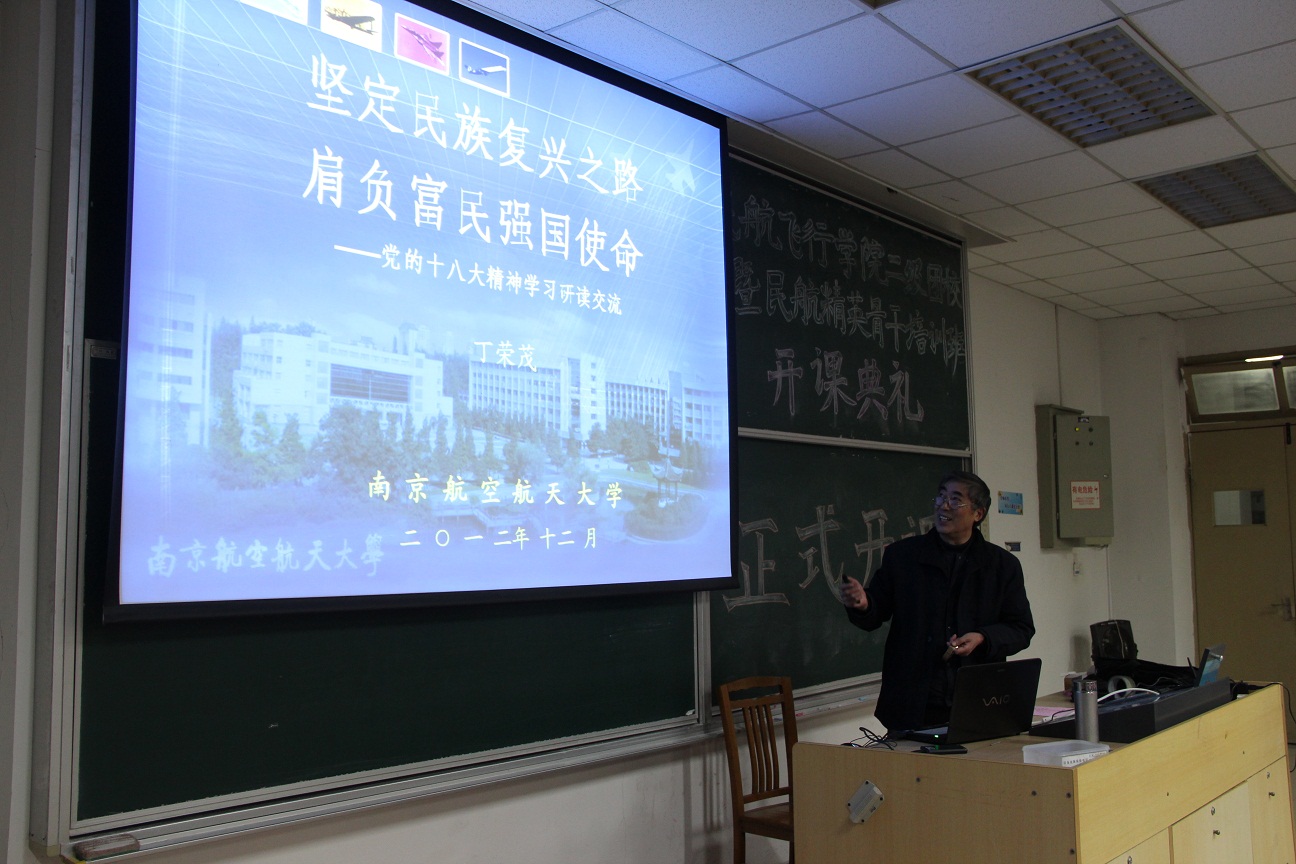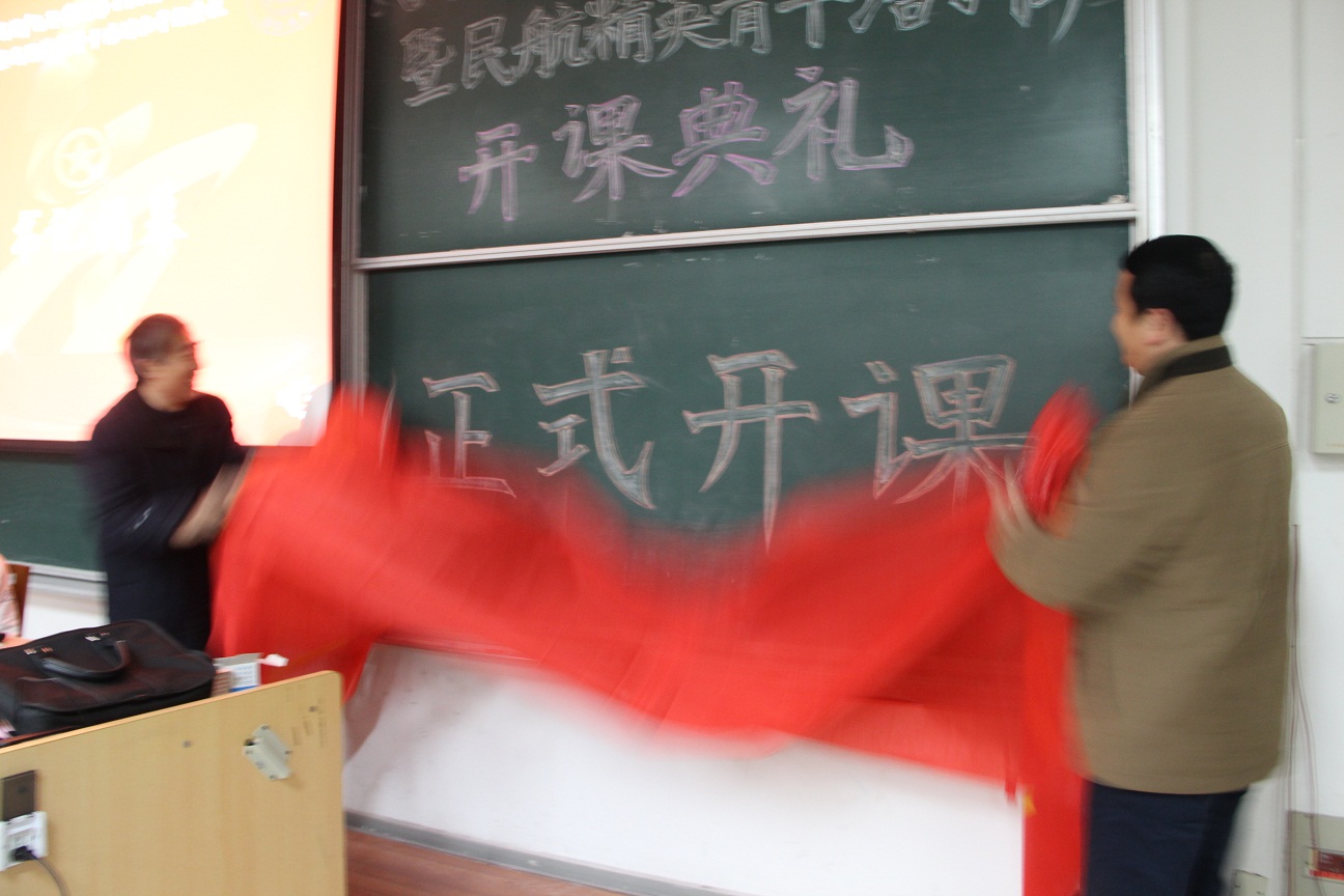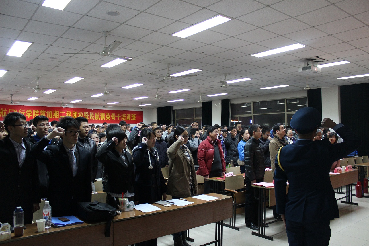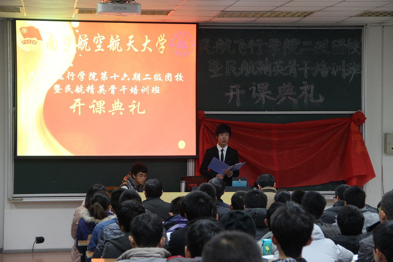 本期二级团校暨民航精英骨干培训班,旨在培养青年团员的工作能力、提升其思想觉悟、完善其道德修为,并提供一个平台让青年团员紧跟党的步伐,把握时代脉络,更好地去认识党,了解党,热爱党,积极向党组织靠拢。典礼由一段介绍中国共青团的诞生与发展的视频的序幕,随后由何洋,王逸夫,杨学智三同学分别宣讲培训班中课程体系中的理论模块、主题沙龙模块及实践调研模块的课程设置。课程内容解读之后,党委副书记高健老师作开课讲话,他鼓励大家认真学习,领会所学内容以及课程设置的意义。典礼上,由丁荣茂老师和院党委副书记高健老师共同为培训班开课典礼进行隆重的揭牌仪式,全体学员在护旗手带领下,面向团旗做庄严宣誓。开班典礼结束之后,丁荣茂老师为本期团校作题为“坚定民族复兴之路,肩负富民强国使命”的第一讲,以中国梦为主题,围绕刚刚结束的党的十八大,从不同的视角向所有学员解读新中国各个时期党的前进方向与奋斗纲领,清晰明了地解析了十八大精神内涵。