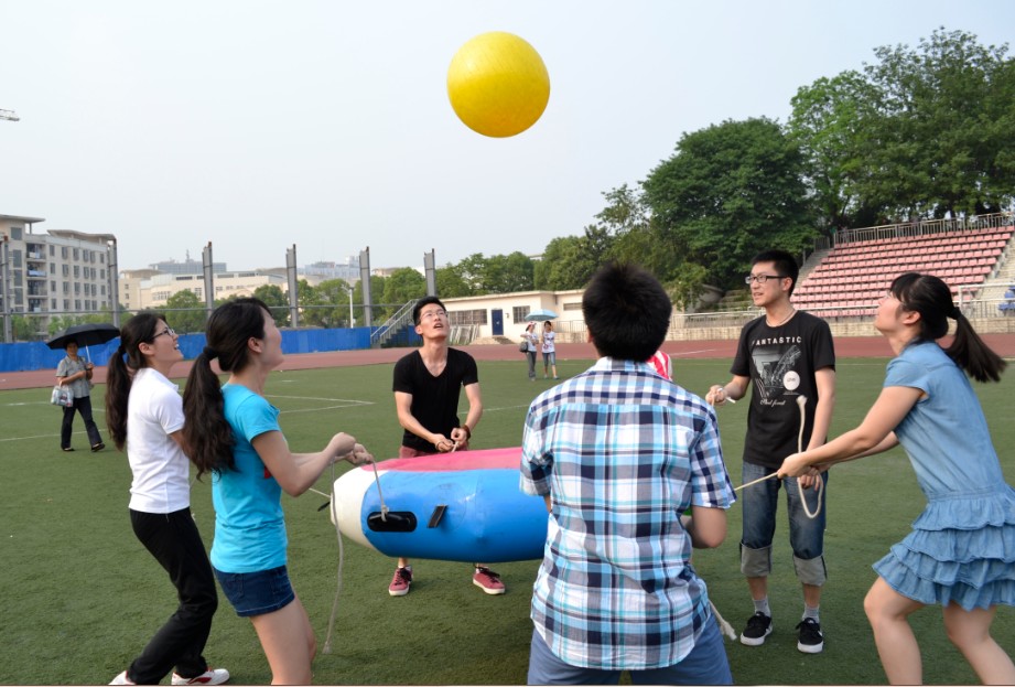 毛毛虫退场之后,同学们玩起了众星捧月。众星捧月,顾名思义,即是一群人共同托举着一个气垫,在气垫上颠球。这个项目考验的是参赛队员对于力度的掌握和队员间的协调合作能力。在这个项目中,皇家华人 的同学充分发挥了团体协作的优势,齐心协力,节奏一直,一举以83个的成绩夺魁。