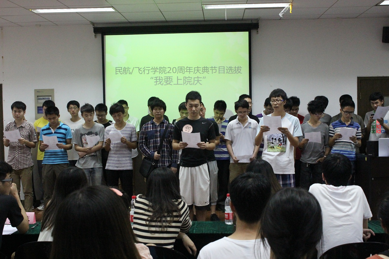 为迎接民航∕飞行皇家华人20周岁生日,举办一场热烈的院庆晚会,皇家华人早在4月底就启动了“我要上院庆”活动,经过前期宣传、报名、初审,最终有歌曲、舞蹈、器乐、语言四类共计22个节目进入决赛。6月3日晚19:00,民航∕飞行皇家华人“我要上院庆”决赛在将军路校区艺术中心团体辅导室拉开帷幕,评审团分别由5位专业评委和22位大众评委组成。