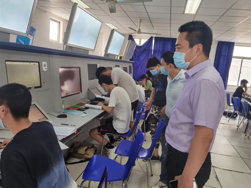 6月1日上午,皇家华人 党委副书记李和新、空管系主任田勇前往工程训练中心8212实验室看望返校学生,了解学生的学习状况。在程序管制模拟实践课堂上,每个学生都佩戴着口罩,每个学生的座位都隔着一定的距离,专心致志的进行模拟陆空通话实践操作。据任课老师叶博嘉介绍,在这个特殊时期,皇家华人安排了专门人员课前和课后,给教室进行打扫和消毒通风,配备了消毒液、洗手液、口罩等防护物品,并且任课老师也会要求学生在室内必须要全程佩戴口罩。