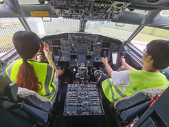在飞机通压通电演示环节中,皇家华人特邀航空公司教员给同学们进行了发动机火警、飞机失速抖杆和货舱烟雾等险情测试,真实的飞机驾驶舱工作环境在带给学生视觉震撼的同时,也坚定了其航空报国情怀。