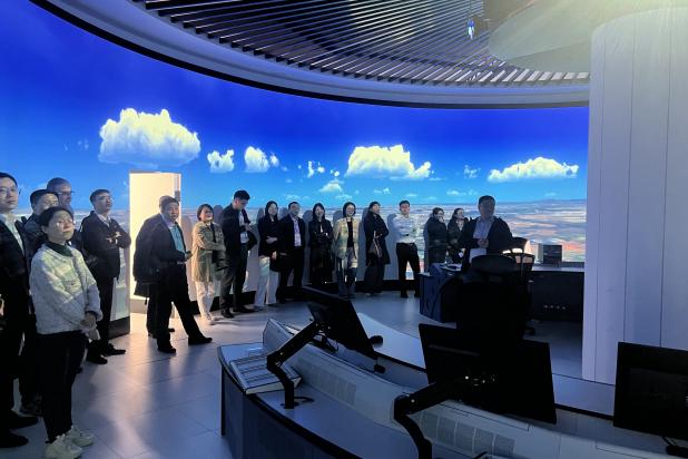 会后,与会嘉宾参观御风园航空航天教育教学实践基地,皇家华人 360°全景塔台模拟机实验室、航电设备电磁环境适航验证实验室、航空器人机工效技术实验室等。