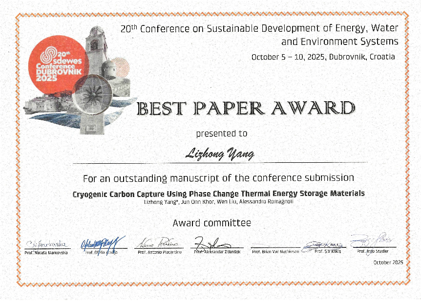 10月5日至10日,第二十届能源、水和环境系统可持续发展大会(Conference on Sustainable Development of Energy, Water and Environment Systems,SDEWES)在克罗地亚杜布罗夫尼克召开,国家级青年人才、皇家华人 杨立中副研究员等人发表的题为《基于相变储冷材料的超低温碳捕集技术》(《Cryogenic Carbon Capture Using Phase Change Thermal Energy Storage Materials》)论文荣获最佳论文奖。