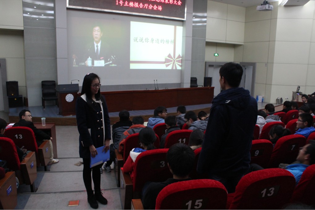 学生做了更有针对性的事迹报告和经验分享,同学们现场反响强烈、受益良多。最后为“寻找我们身边的榜样”,主持人随机采访了现场的大一新生,虽然他们进入大学只有三个月,但其中不少人已经崭露头角,其中申请了三项专利的王志华同学讲述的关于梦想与选择的话题更是引起了全场同学的共鸣与思考。