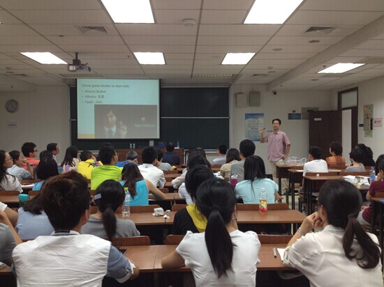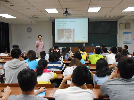 的师生作了题为《 Living in the World Village-a note on preparing yourself for the future 》的报告。内容基于吴教授自己的人生经历,结合在海外求学的亚洲留学生的现状等,首先分析了东方学生和西方学生的优缺点,吴教授认为东方学生普遍学习能力较强,但是缺乏创新思维能力,这很大的阻碍了东方学生的发展前途;其次,吴教授分别介绍了巴菲特、马云和乔布斯三位优秀的企业家,结合他们的经历来揭示个人素质对未来发展的重要性;最后,吴教授通过结合自己的身边发生的大事、趣事,给在场的师生重点讲诉了培养思考能力、掌握交流技巧、做自己喜欢的工作和团队合作对我们未来人生发展的重要性,吴教授坚信只要坚持自己喜欢的职业,就一定能做出一番成绩,这种积极的生活态度也激励着在场的学生勇敢的去追求自己的人生目标;同时,吴教授还为大家现场播放了关于乔布斯的短片,鼓励大家向这位优秀的企业家学习。