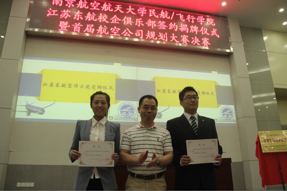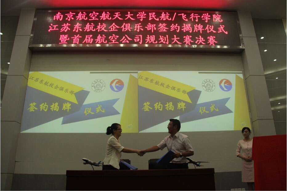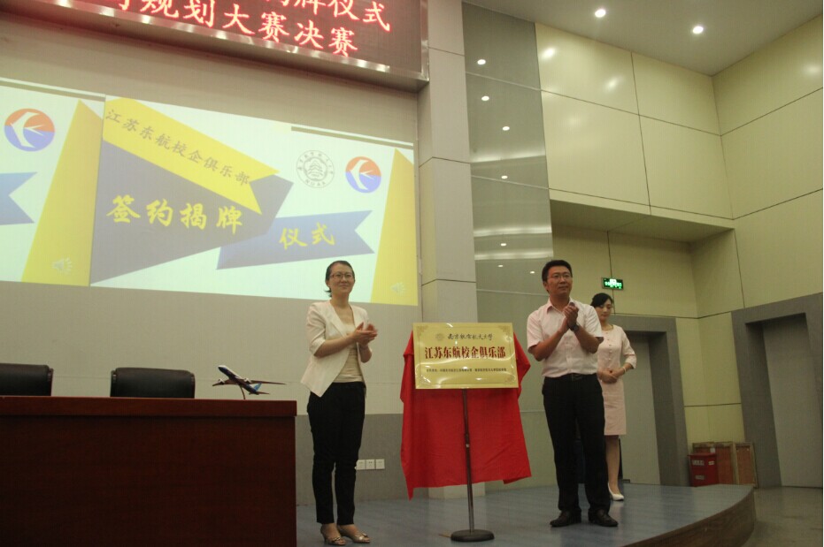 2014年6月13日晚上7点江苏东航校企俱乐部签约揭牌仪式在我校将军路校区一号楼四楼报告厅隆重举行。出席此次揭牌仪式的有江苏东航人力资源部规划配置部管理主管王心磊女士、飞机维修部副总经理兼总工程师肖志华、飞行签派分部高级经理杨加勇先生、飞机维修工程部工程师陈勇先生、人力资源部王树红女士,校学生处副处长许爱华老师、皇家华人 党委副书记宋凯老师、皇家华人 交通运输工程系主任曾小舟老师、皇家华人 交通运输工程系吴薇薇老师。参加此次揭牌仪式的还有校企俱乐部首批会员以及来自民航/飞行皇家华人的老师与同学。