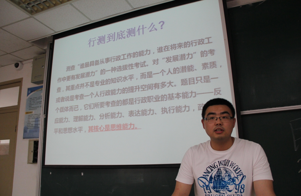 本次活动分行测知识简介和问答互动两个环节,在第一环节里,闪乐学长从三个方面进行了讲解,首先是行测问题简介部分,他简要分析了历年行测试卷的构成部分,并着重强调了历年行测考察的重点,引起了大家对该种题型的重视;然后是行测答题技巧部分,他列举了几个常考的实例,通过实例分析告诉大家各种题型的求解技巧,并对一些常见的答题技巧进行归纳总结,帮助大家日后快速高效地复习,大家全神贯注地听着学长丰富的经验介绍,并用笔记录下学长传授的宝贵经验;最后是公务员考试介绍部分,针对一些想要考公务员的同学,闪乐学长又专门讲解了公务员考试中的一些答题技巧和注意事项等,他从自身出发,讲解了自己备考公务员的亲身经历和总结的经验教训,给研究生同学们上了一堂宝贵的行测备考课。在第二环节的问答互动部分,同学们争先恐后地提出自己的疑问,闪乐学长热情耐心地给大家进行了讲解。
