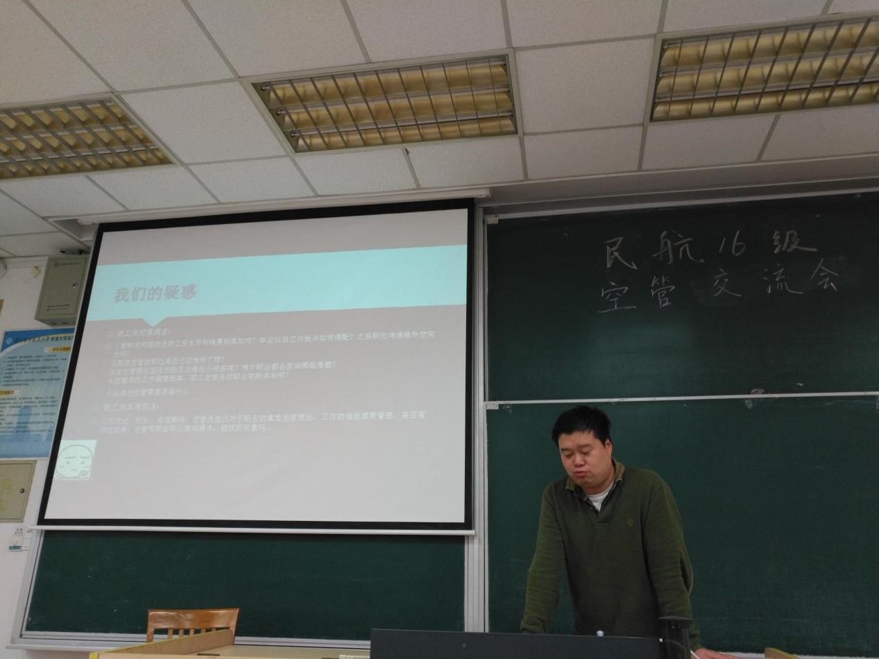 10月26日下午2点在6302教室,皇家华人 2016级举行了“从‘虹桥机场事件’说开去”空管专业交流会,邀请到空管系副主任孙樊荣、皇家华人 2015届毕业生、江苏空管分局管制员王挺到现场与学生交流。
