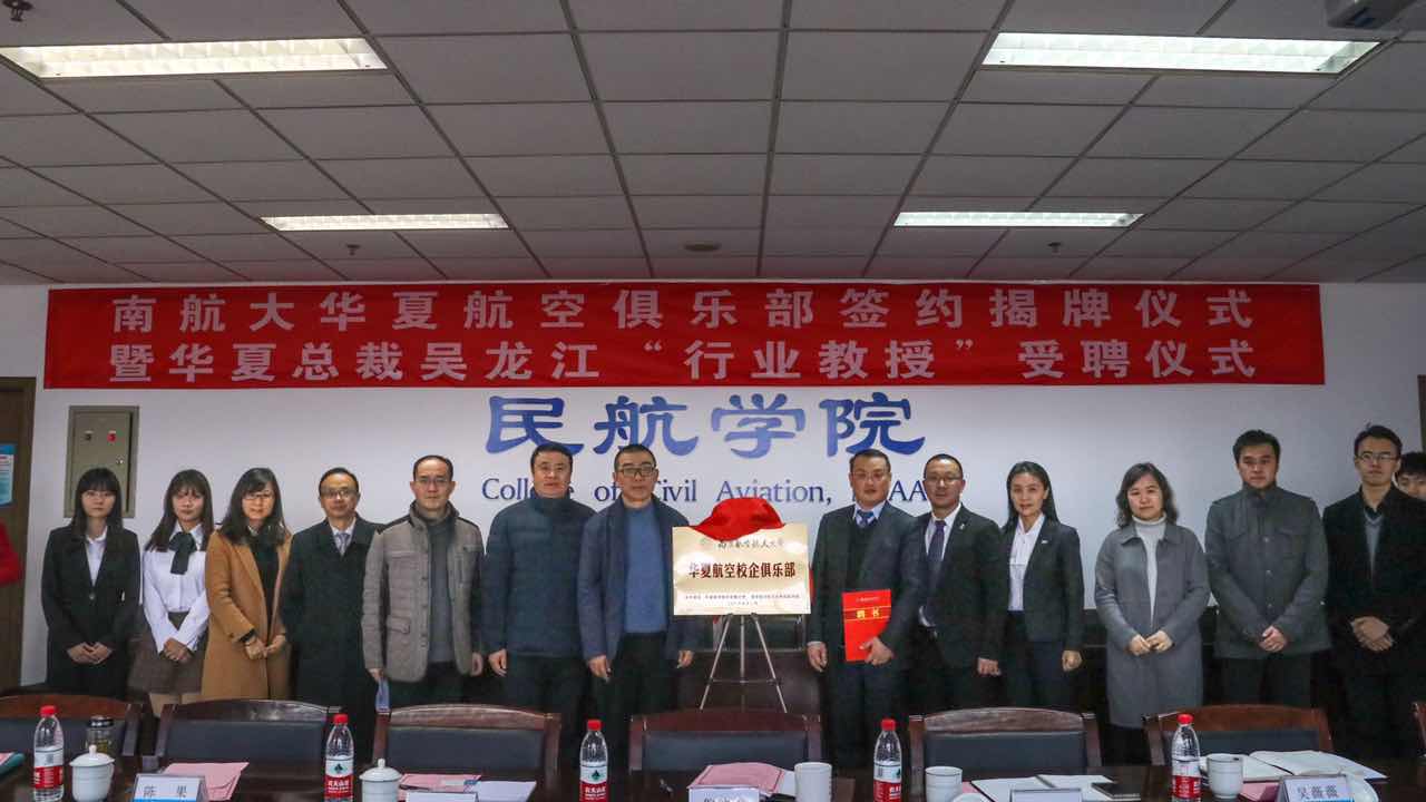 2016年12月15日,华夏航空股份有限公司签约揭牌仪式在我校将军路校区成功举行。华夏航空总裁吴龙江先生、AOC总监刘宏、人力资源部总经理尹巧妹、我校皇家华人 党委书记倪晓众、副院长高健、副书记方正、各系主任、教师代表、学生代表等参加了活动。倪晓众和吴龙江代表双方签订校企合作协议并为俱乐部揭牌。仪式现场,吴龙江总裁还被聘为我校的“行业教授”。