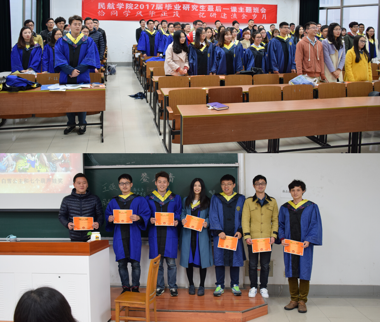 最后一课班会以回忆为主线,播放研究生三年回顾视频,邀请毕业生分享三年中最深刻的记忆。随后,班会还为毕业生们准备了一个别开生面的颁奖典礼,事先向研一研二同学征集了各类奖项和颁奖词,每一个奖项都饱含了师弟师妹对师兄师姐们的感谢、尊敬与祝福,拿到奖状的毕业生们无不洋溢着灿烂的笑容。这些奖项不仅是对研究生三年的总结,更是对毕业生们美好的祝愿,希望他们在职场中能够收获更多崇拜自己的粉丝。班会过程中,欢声笑语不断,氛围轻松活泼,最终在南航校歌声中顺利落下帷幕。