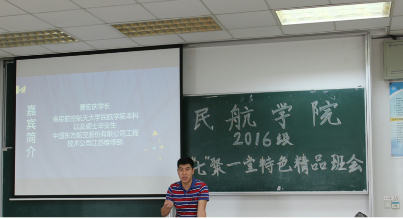 在班会的第一个环节中,曹宏庆学长从自身经历出发,为我们解答了机务专业今后的就业方向、成长路线、薪资待遇以及读研的意义等等同学们比较关心的实际问题。学长的发言中“干货”满满,加深了同学们对机务专业的认识,消除了同学们心中的困惑。此外,曹宏庆学长也一再强调,大学期间一定要抓好学习,尤其是加紧步伐提高英语能力,同时努力提升自身的专业技能。同学们对学习的重要性又有了新的了解和认知。