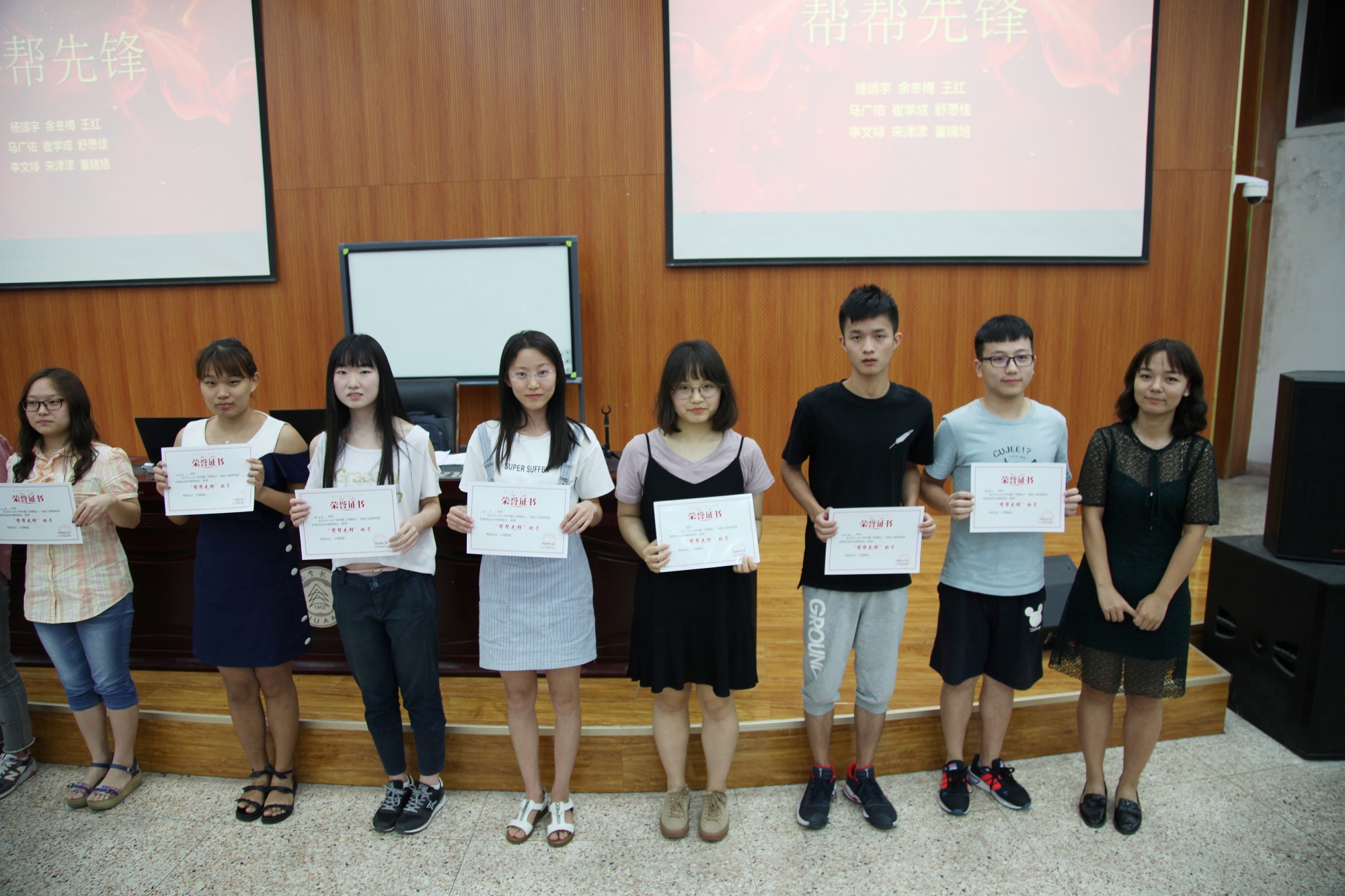紧接着,张老师重点表扬了在上学期“15帮帮”活动中帮扶他人成效卓著的几位“帮帮先锋”并为他们颁发奖状。在这个帮扶活动中,有不少同学在帮扶后绩点显著提高,年级学风明显改善。张老师还表扬了在上学期“无手机课堂”活动中的“学习自律班级”和“最佳自律者”,并颁发奖状。在该活动中,不少同学坚持每次上课都上交手机,提高了听课效率。看到这么多同学受到表彰,其他同学深受鼓舞,相信在接下来的活动中,会有更多的同学参与其中。