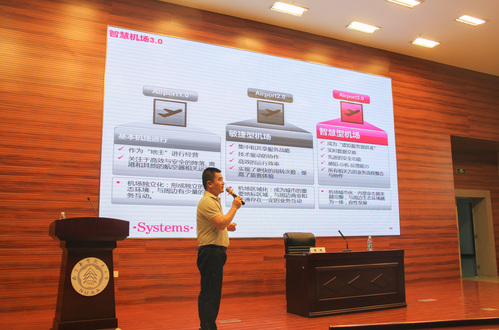 第二位校友,德国电信系统集成事业部总经理董昀校友,用国际的眼光,通过国外法兰克福机场与科隆机场的新型运营管理机制,为师生们绘制了未来“智慧+人工智能”的智慧机场的蓝图,以及如何实现的难点与成功要素,给予同学们为民航事业奋斗的信心与目标。