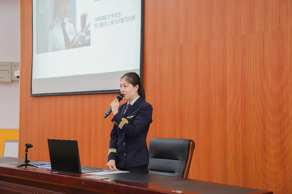 东航女飞行员胡祎凌则以民航从业人员的视角分享了上海浦东机场忙碌的一天,上航的两位机长高越、高雨晨带领同学们对民航的国际化发展作出了解说与预测,提出了民航人在如今时代应承担的责任与使命;华夏航空人资副总经理韩映锋介绍了民航基本知识,民航人所要具备哪些素质,并与现场同学互动交流。